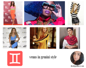 - Venus in Gemini Styleby NonaHello everyone, Here is my video detailing the fun and dynamic patterns I’ve picked up on as I researched a handful of famous Venus in Gemini women. Gemini is the sign of electricity- it rules the nervous system which sends messages (communication) through little volts called action potential. This process depends on a change in polarity- so here we face the most dual of signs. To no surprise but