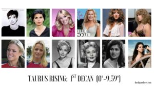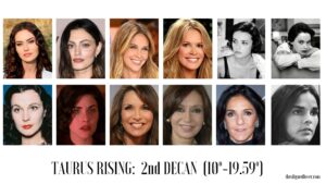 - Taurus Rising First Decan (0-9.59°) Cosmic Twins: ♉ Ascendant Celebrity Lookalikesby NonaWelcome to my ongoing series where I dive deep into the fascinating world of Rising Signs by Decan. Today, we’re focusing on the Taurus Rising First Decan, specifically individuals born with their Ascendant between 0 and 9.59 degrees of Taurus. My goal isn’t to find a single, unifying look for all Taurus Risings, but rather to explore intriguing physical similarities – what I like to call “cosmic twins” –