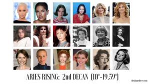 - Aries Rising Second Decan: Exploring Cosmic Twins and Celebrity Lookalikes of Aries Ascendant 10-19.59°by NonaWelcome to another installment in my series exploring Rising Signs by Decan. Today, my focus is on the Aries Rising Second Decan, covering individuals with their Ascendant in tropical calculations from 10° to 19.59°. As always, I gather my data from astrotheme.com. While some prefer different calculation methods, my research is based on tropical astrology. Just like with the first decan of Aries, I didn’t identify a single, unifying