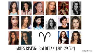 - Aries Rising Third Decan: Cosmic Twins and Celebrity Lookalikes with Aries Ascendant 20-29.59°by NonaWelcome back to my channel! I have another video in my series, where I’m looking at all 36 decans of all 12 zodiac signs in order. Apologies to Pisces Rising Three for having to wait the longest, but today, I’m finishing off the sign of Aries by looking at the Aries Third Decan. If this is your rising sign, falling between 20° to 29.59° Aries, you might just find