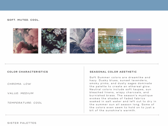 The Soft Summer Palette In the 12 Seasonal Color System, Soft Summer (also referred to as Summer-Autumn) is a season dominated by softness and coolness…