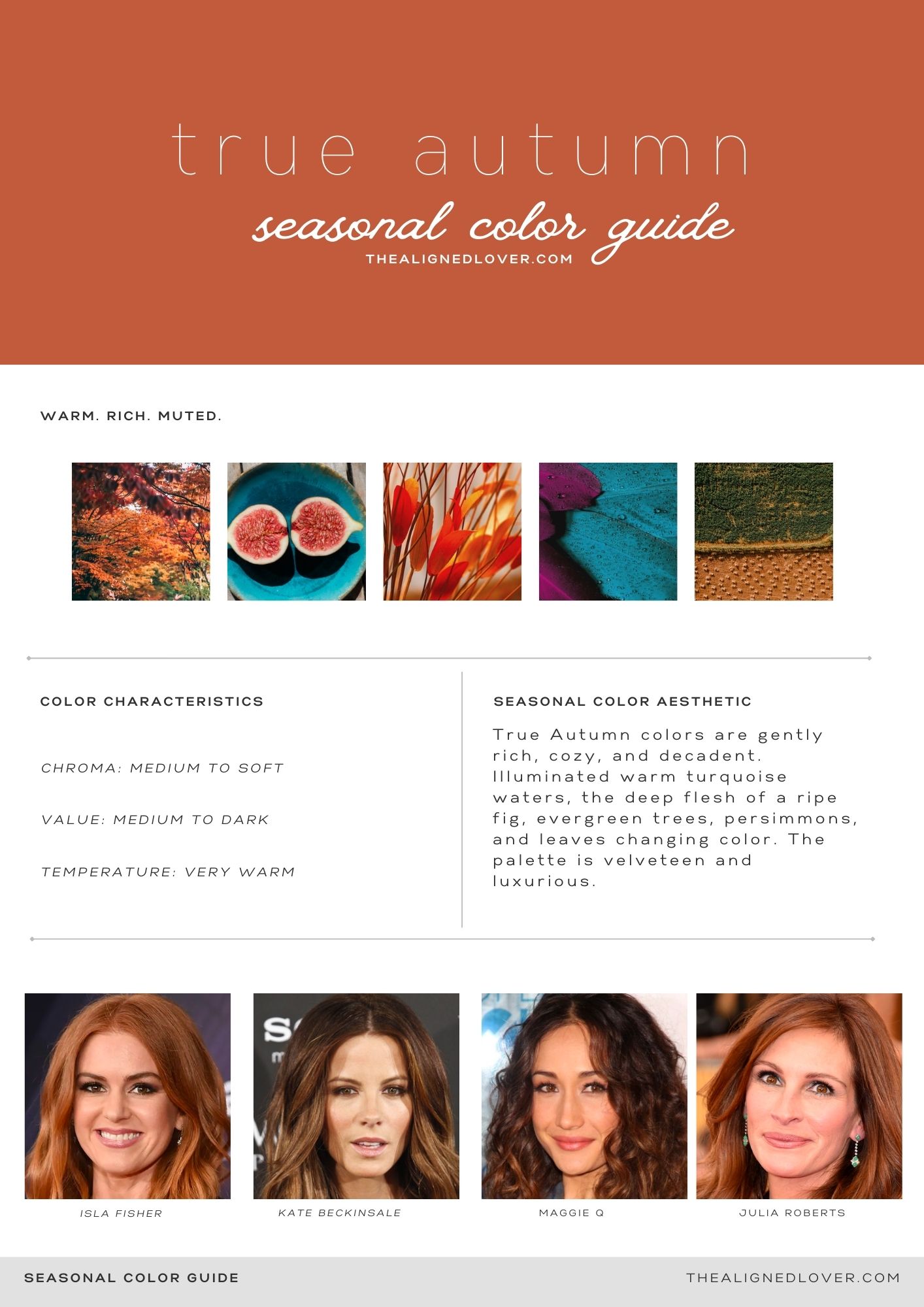 True Autumn Seasonal Color Palette In the 12 Seasonal Color System, True Autumn is a season dominated by dark warmth and a touch of softness…