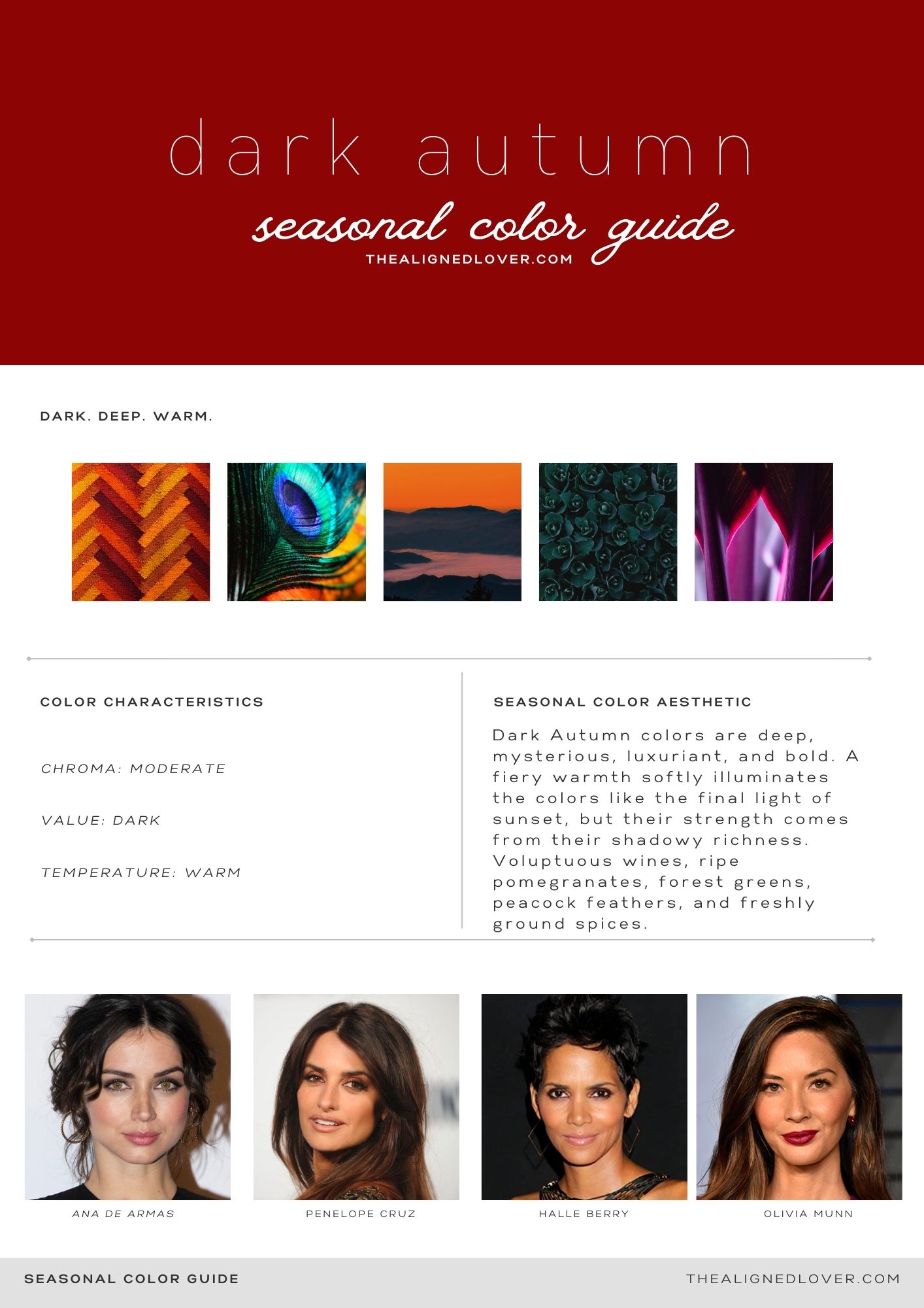 Dark Autumn Seasonal Color Palette In the 12 Seasonal Color System, Dark Autumn or Deep Autumn is a season dominated by darkness, depth, and warmth…