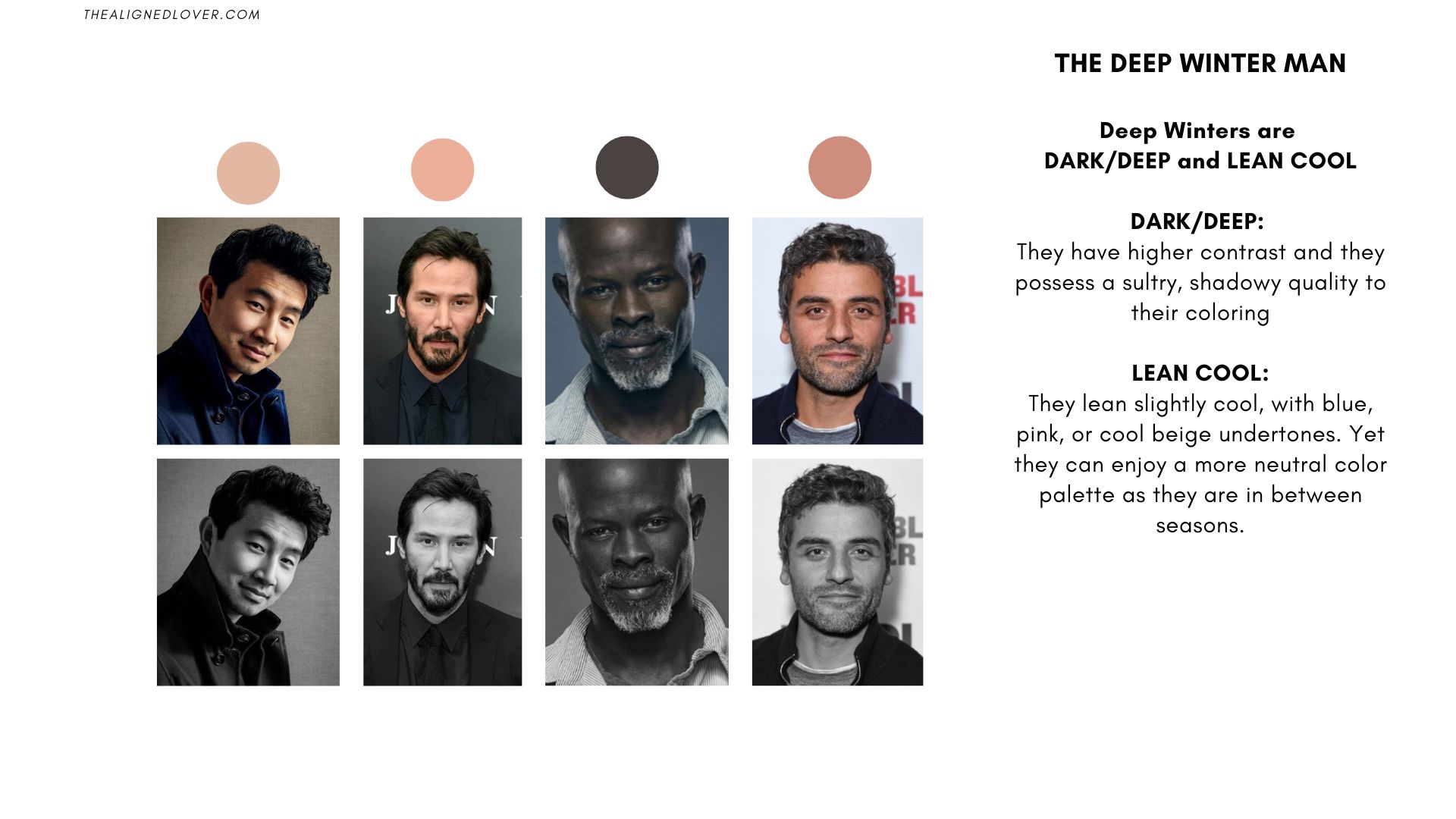 The Deep Winter man sits between Deep Autumn and True Winter in the seasonal color system. His primary characteristic is darkness, followed by cool undertones. The best way to describe Deep Winter’s coloring is shadowy, mysterious, and smooth.