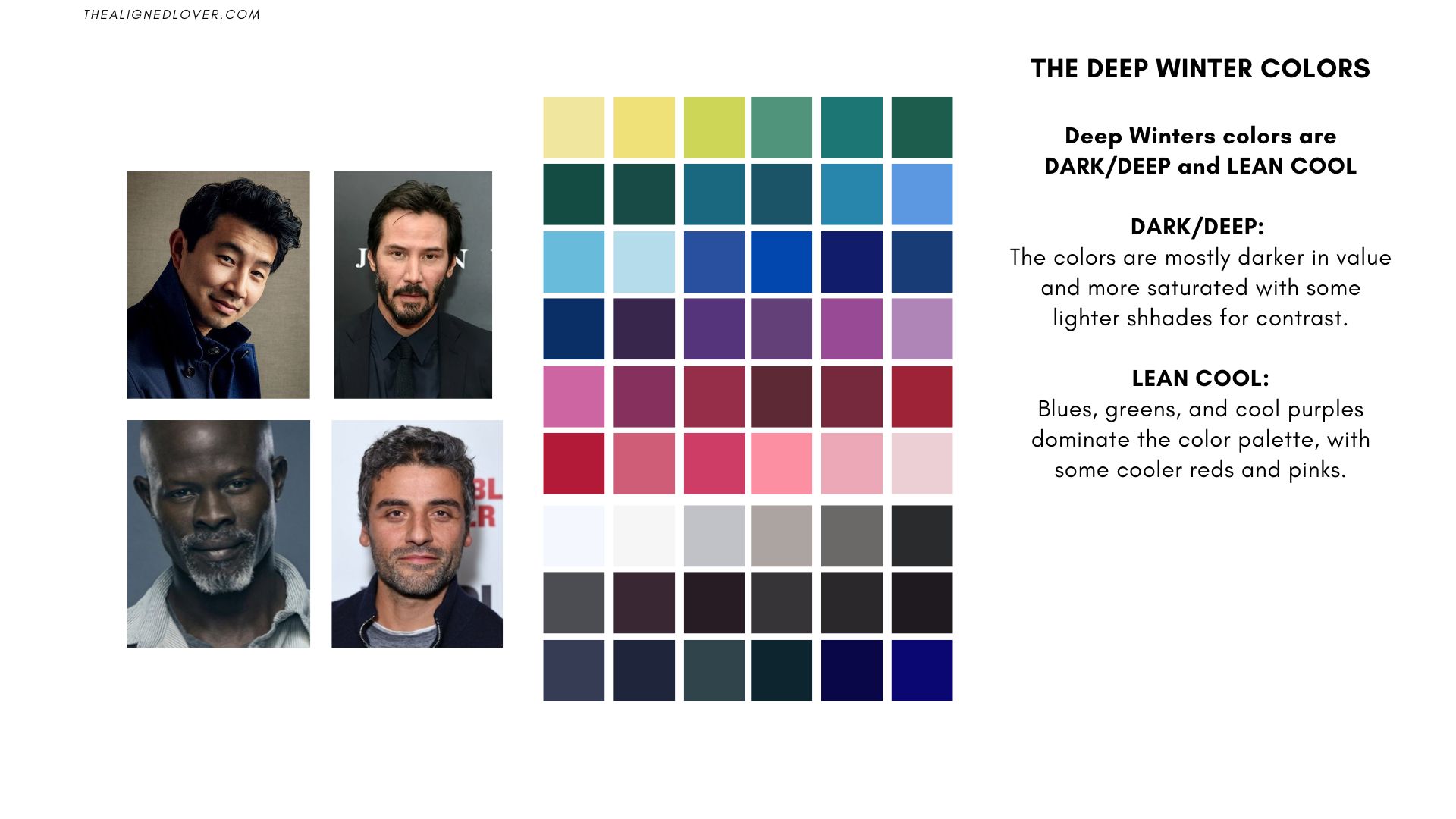 If you’re new to seasonal color analysis, check the following links for articles and videos that cover the foundations of seasonal color. This post will help you understand Deep Winter characteristics, identify the best colors, and see real-life examples of celebrities who embody this palette.