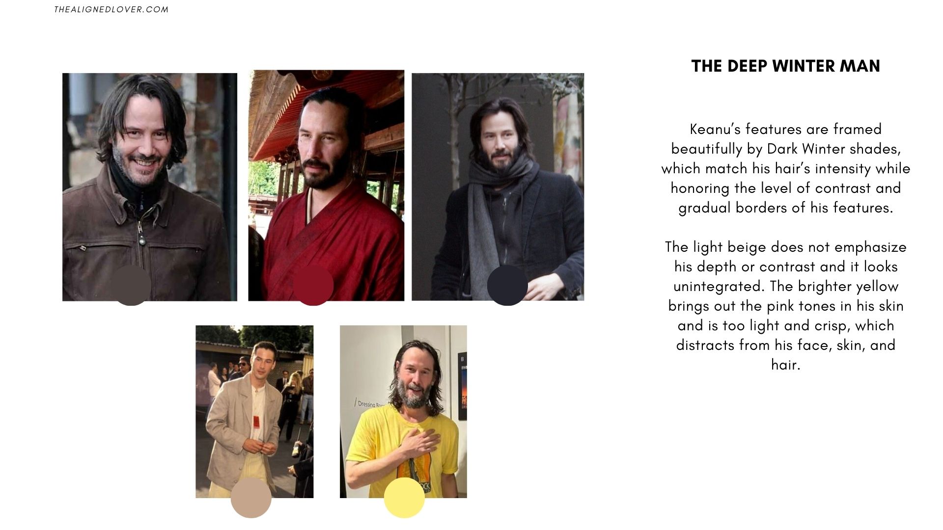 Keanu frequently wears Deep Winter shades like black, charcoal, deep green, and dark brown—all of which emphasize his sharp features and strong contrast.