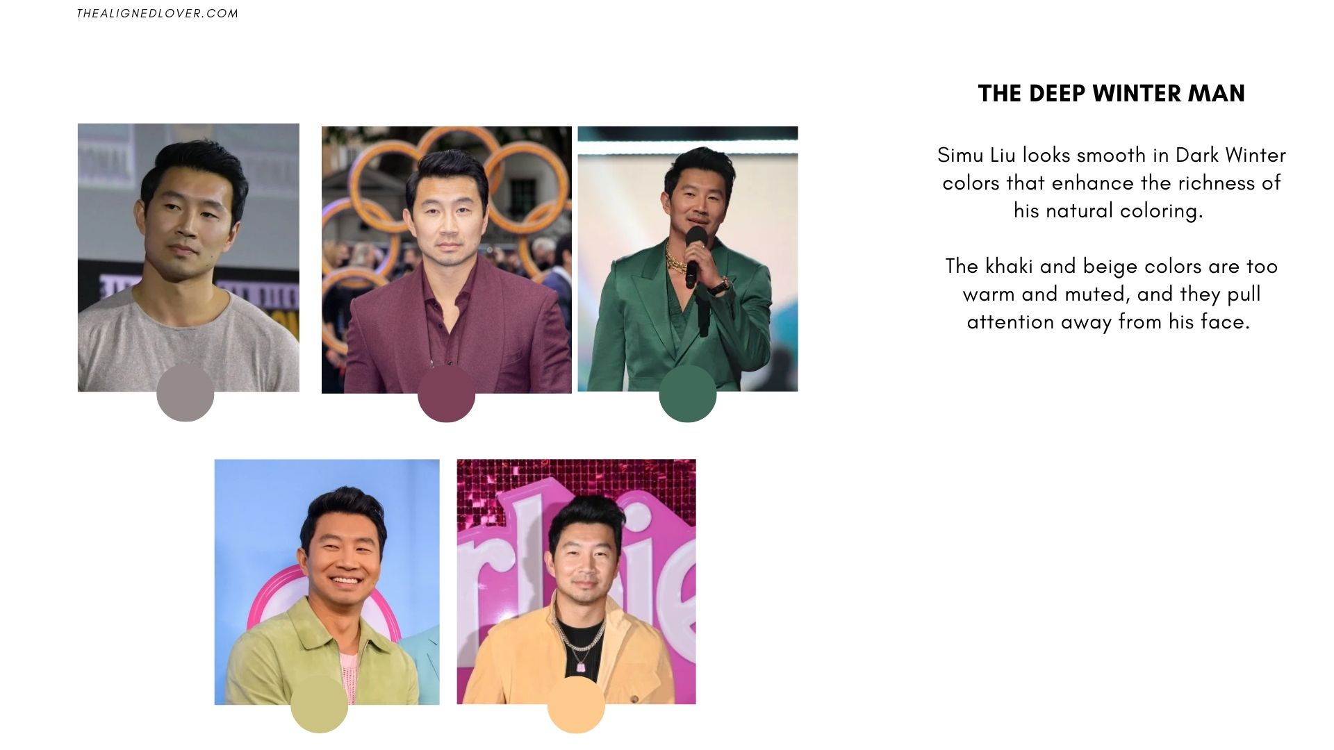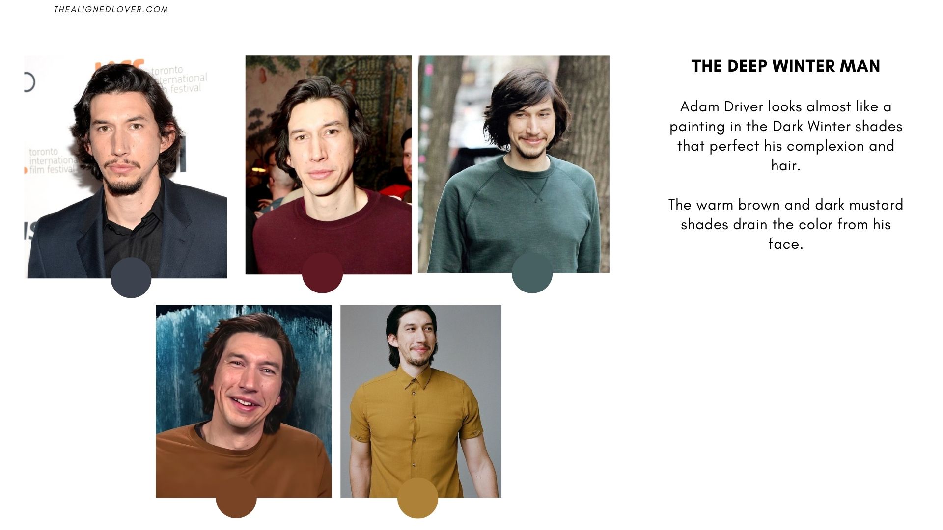 In contrast, mustard yellows and warm browns clash with his natural cool undertones, making them appear separate from his overall look.