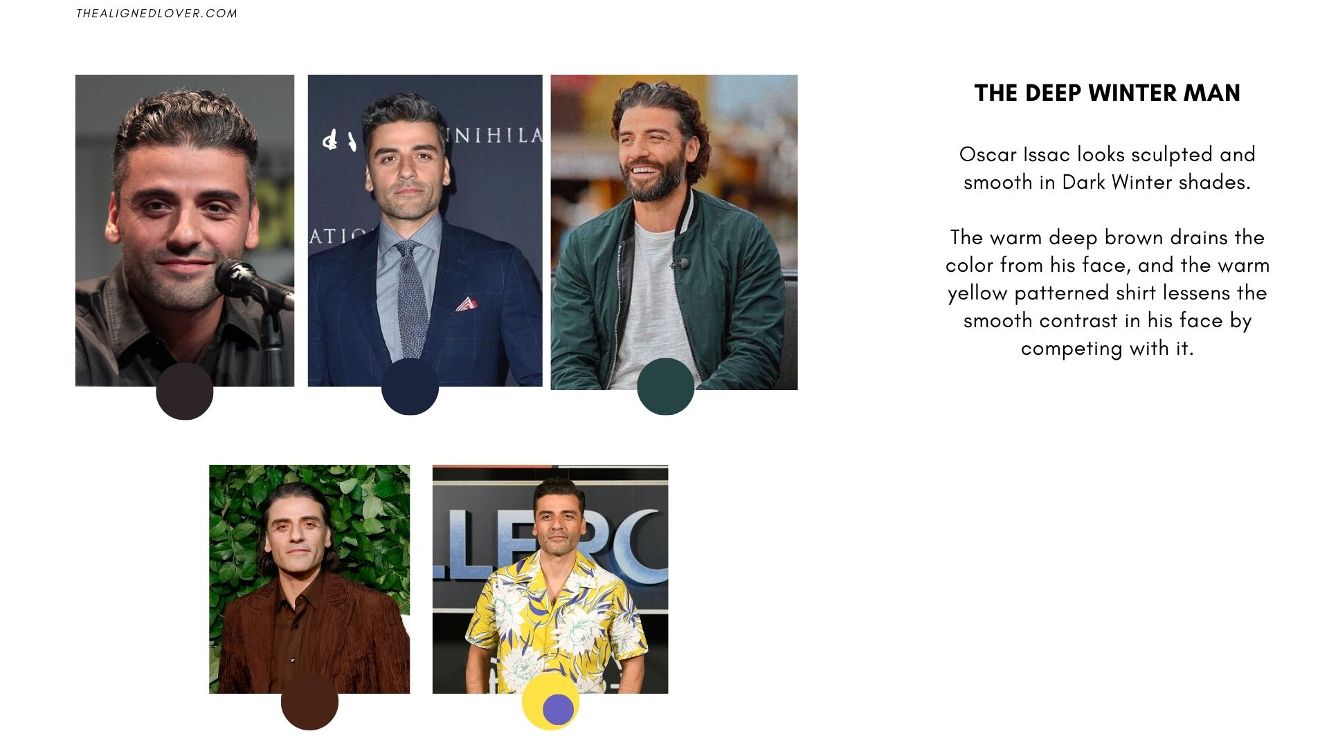 Oscar looks elegant and refined in Deep Winter’s bold, sophisticated palette. Dark blues, charcoals, and cool reds enhance his mysterious, charismatic look.