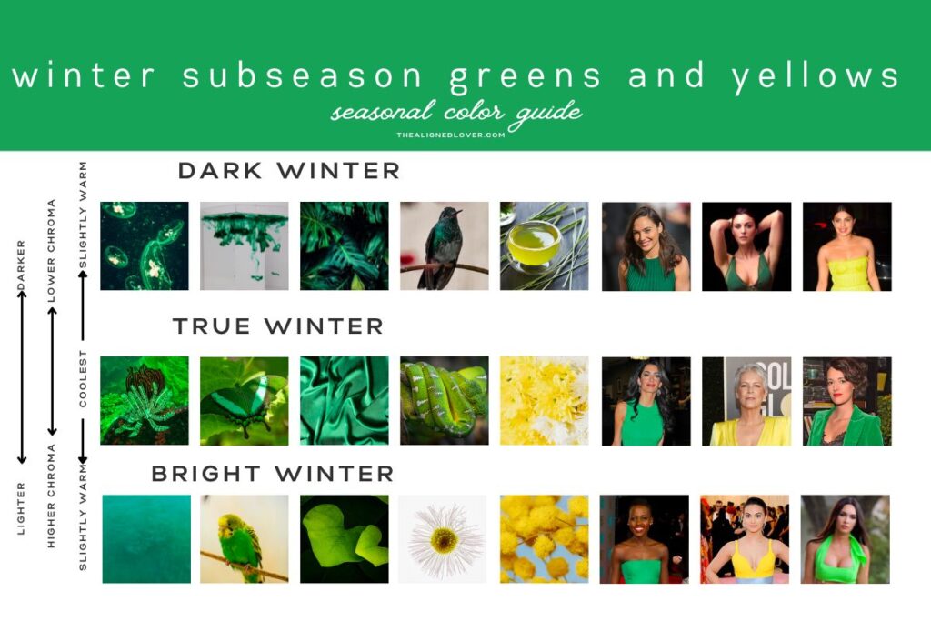 Dark Winter greens exude an inky and sensual aura, while True Winter greens adopt a silky and chartreuse demeanor. Bright Winter greens, with their neon vibrancy, showcase the most energetic facet of the palette. Dark Winter yellows assume a dark yellow-green nuance, while True Winter gravitates towards true yellows. Bright Winter, on the other hand, thrives in the realm of bright yellows and neon greens.