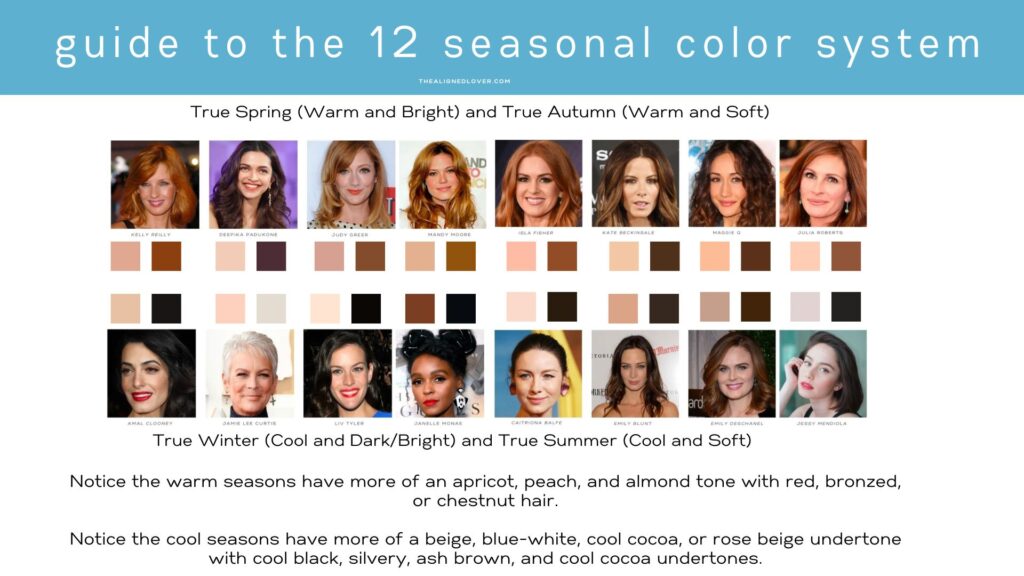 The warm seasons possess a strong apricot, peach, almond, and overall golden tone to their skin and a reddish, bronzed, or chestnut tone to their hair.