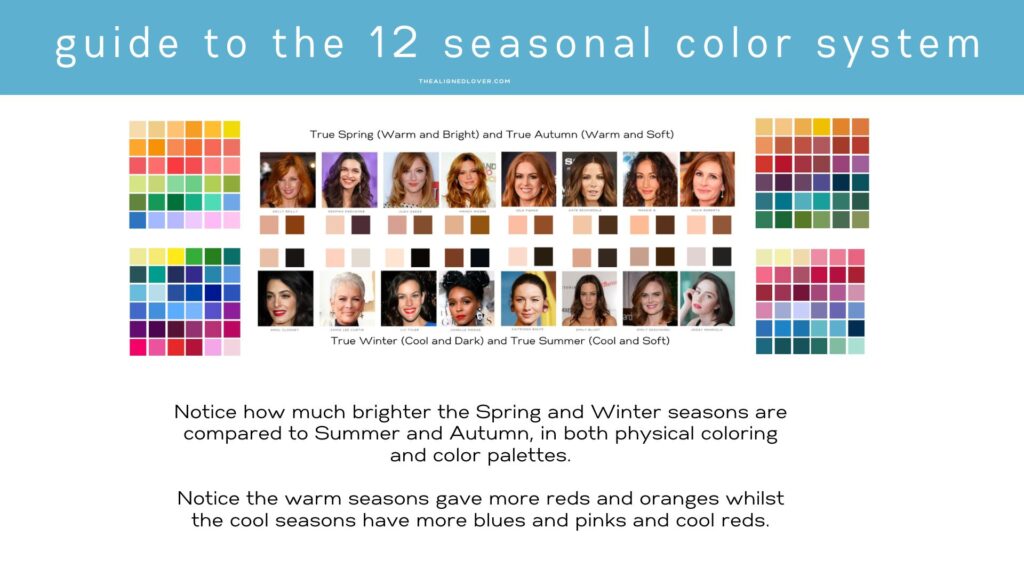 The same qualities seen in the general tones of the skin and hair are also seen in the seasonal palettes. Notice the dominance of warm hues (reds, oranges, yellows, and greens) in the True Spring and True Autumn palettes. Compare that to the dominance of blues, purples, and cool pinks in the True Winter and True Summer palettes. Even the hues that seem to be of the opposite temperature (i.e. yellows in cool seasons and blues in warm seasons) are still relatively warmer or cooler.