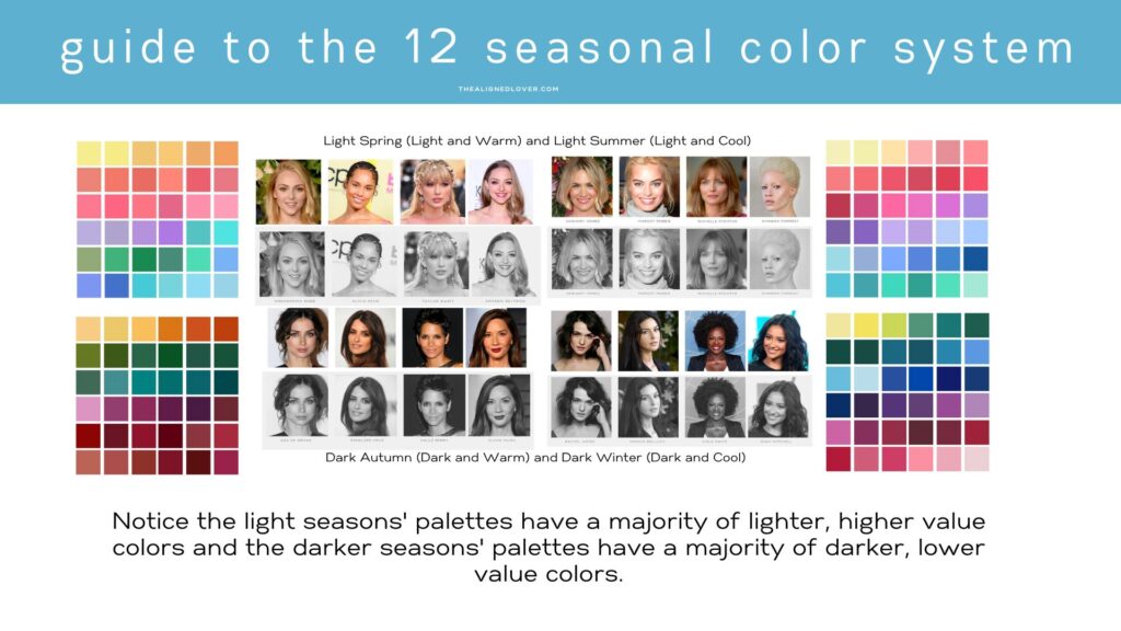 Notice the range of values in the light seasonal palettes- they are predominantly lighter with little dark values. The dark seasonal palettes are mostly dark with very few lighter values. Also notice their respective secondary traits of hue temperature.