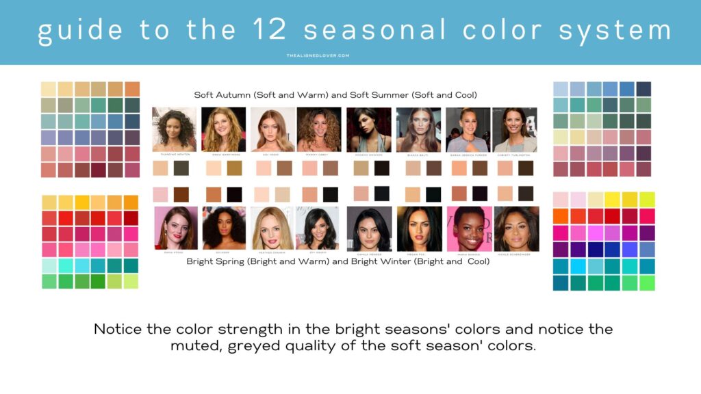 Starting from Bright Spring on the very left , watch how the palette lessens in chroma and deepens in warmth into True Spring. Next, the colors shift to very light values and gain a bit of coolness in Light Spring, and then transition into even more coolness in Light Summer. True Summer retains that coolness and a bit of lightness, but ultimately lessens in chroma. Chroma drops to the very lowest in cool Soft Summer, which also gains a bit of warmth. Even warmer and just as muted is the next season of Soft Autumn. Warmth prevails in muted True Autumn, with some darkness also making its presence. Darkness then dominates with Dark Autumn, a palette that leans into some coolness as well. Darkness and then coolness dominate in True Winter, which also gains in chroma. The chroma becomes very high, with predominantly cool colors mingling with slight warmth in Bright Winter.