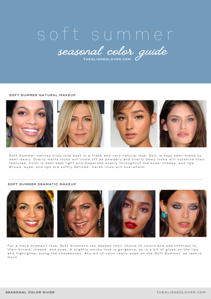 For more dramatic looks, Soft Summers can add a bit of depth and increase their contrast by darkening the definition around their brows, eyes, cheeks, and lips. Still, the edges of all of their features should remain soft with no harsh boundaries.