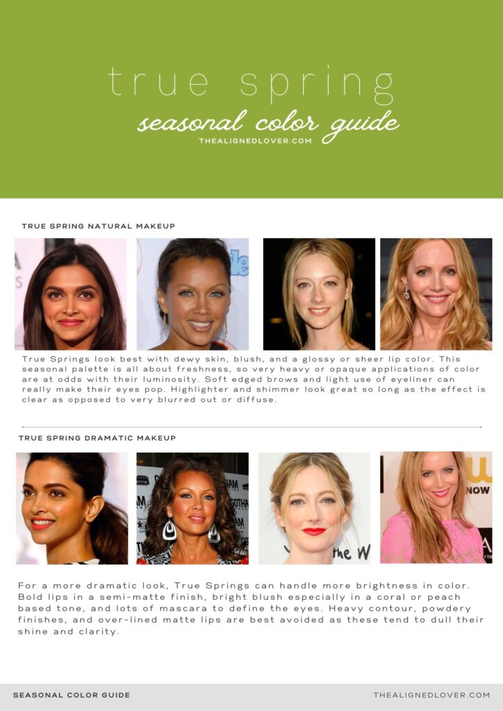 True Springs can create a dramatic look by going for bolder color use- bright tomato red or hot pink lipsticks can handle a slightly matte finish. The eyes can be given a bit more depth and definition with darker shades in the crease and a shimmery color on the lids. Still, the dewy and radiant base is paramount. Blush or peachy contour honors their moderate contrast and prevents the bolder lip from dominating the face.