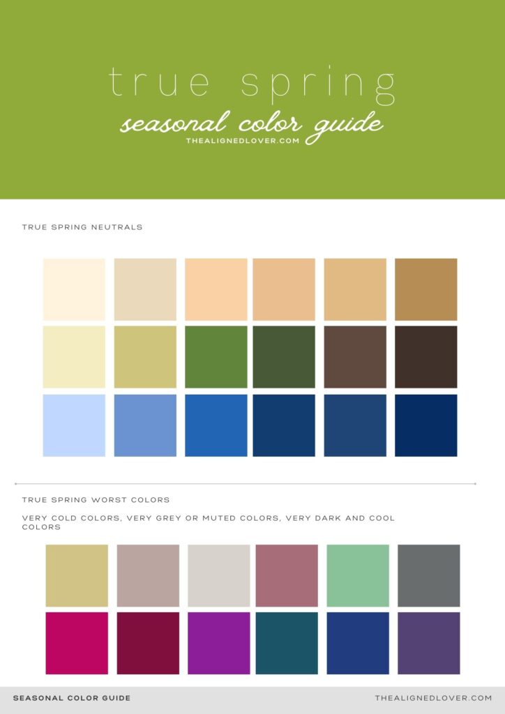 In the 12 Seasonal Color System, True Spring (or Warm Spring) is a season dominated by warmth, clarity, and brightness. (Warm and Bright). True Spring falls between Bright Spring (Bright and Warm) and Light Spring (Light and Warm). The palette focuses on colors with high chroma (far from very muted), a range of moderate to lighter values, with an emphasis on the warmer hues (reds, oranges, yellows, and greens).
