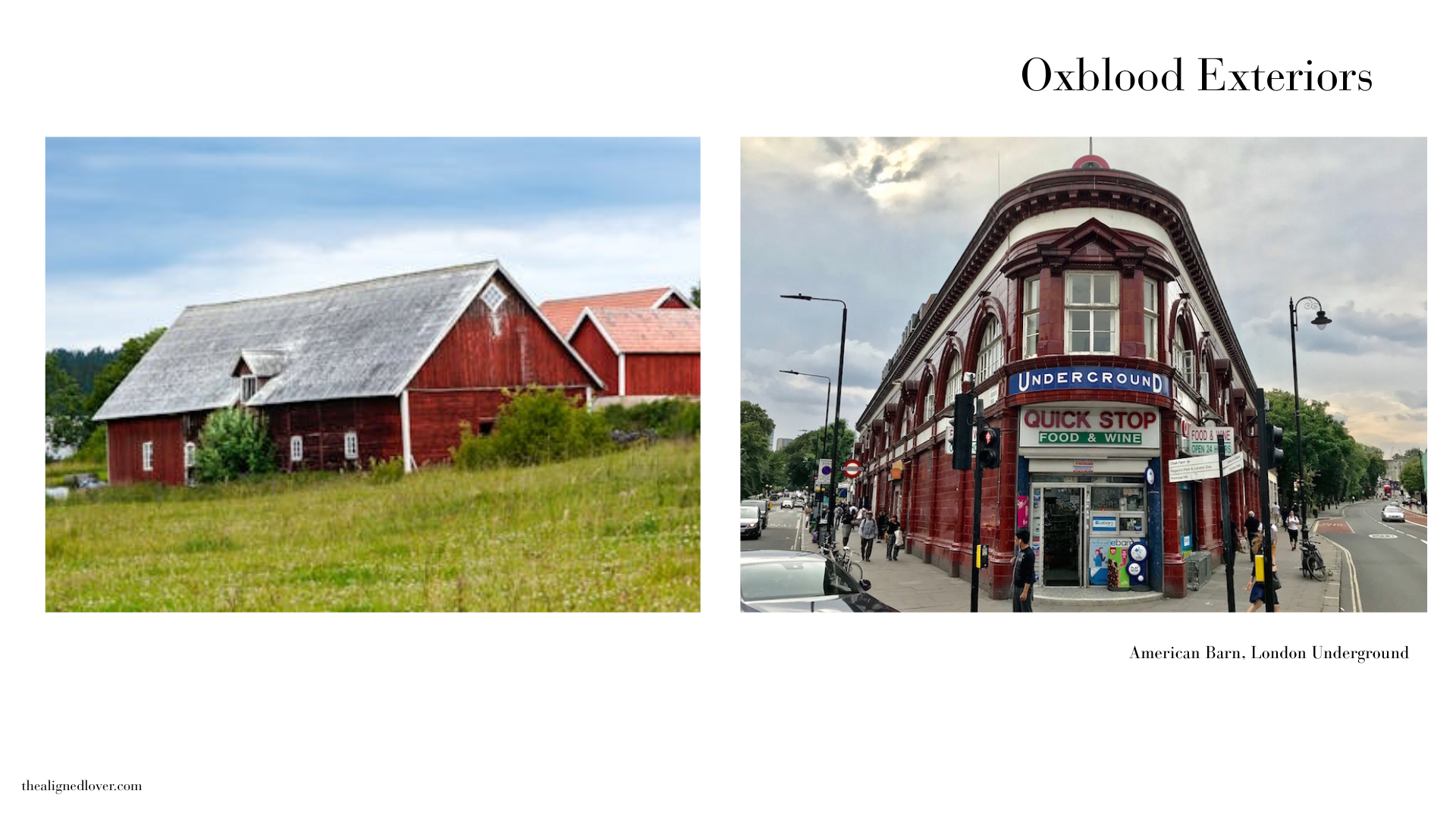 The hue also appears in ceramics, known by its French name sang de boeuf. This copper-oxide glaze features prominently in 18th-century Chinese pottery, created in homage to the sacrificial red glazes of the Ming dynasty. Its depth and luminosity made it one of the most coveted ceramic finishes in history. In fact, the technique carried beyond pottery: in the early 1900s, architect Leslie Green used sang-de-boeuf glazed terracotta tiles to clad many of the first buildings of the London Underground—most famously Maida Vale station, whose oxblood façade remains a visual landmark.