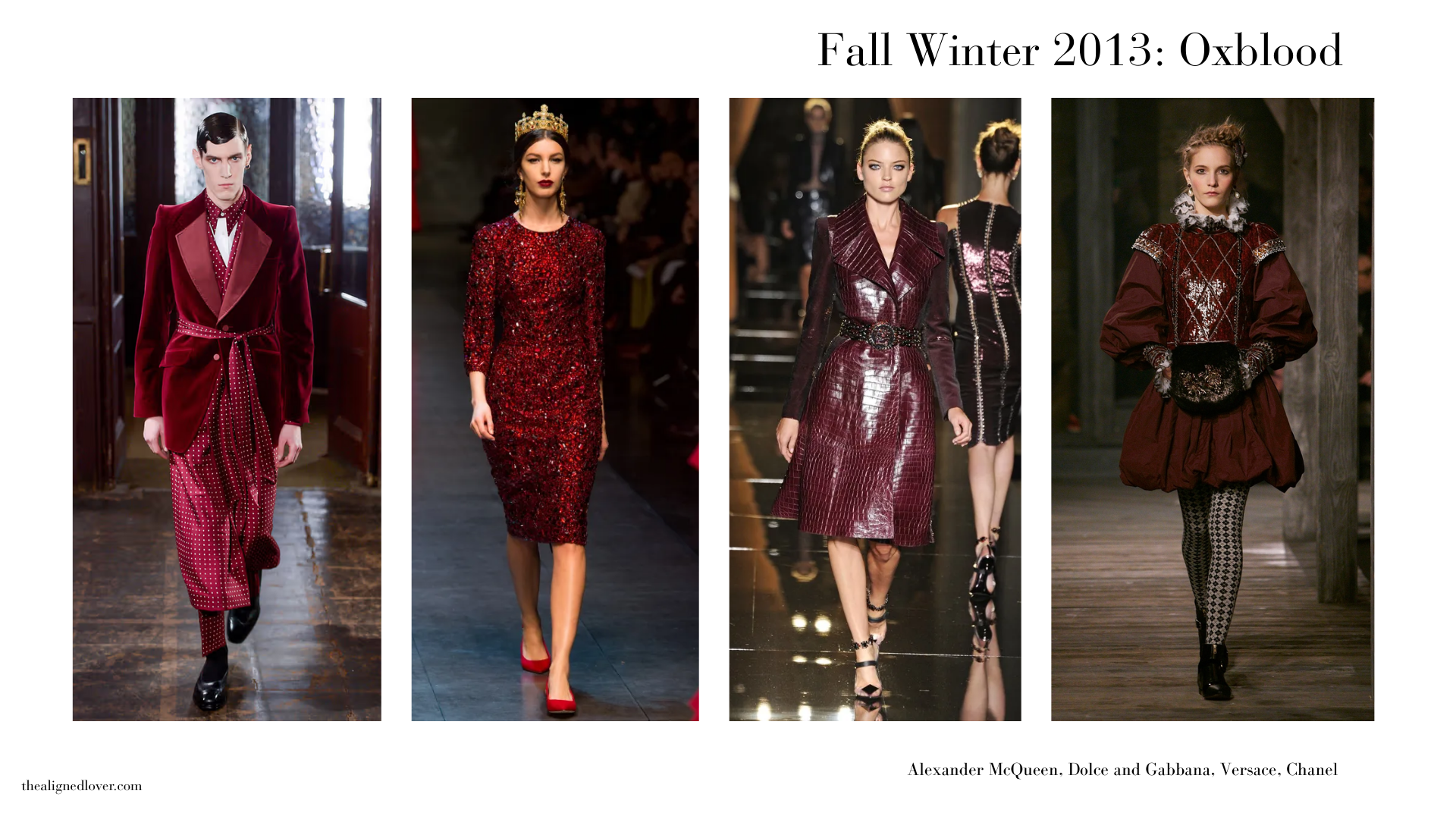 Oxblood had a particularly strong moment during the Fall/Winter 2013 season. The color added depth to more modern snakeskins and sequins while adding sensuality to dapper and religious themes.