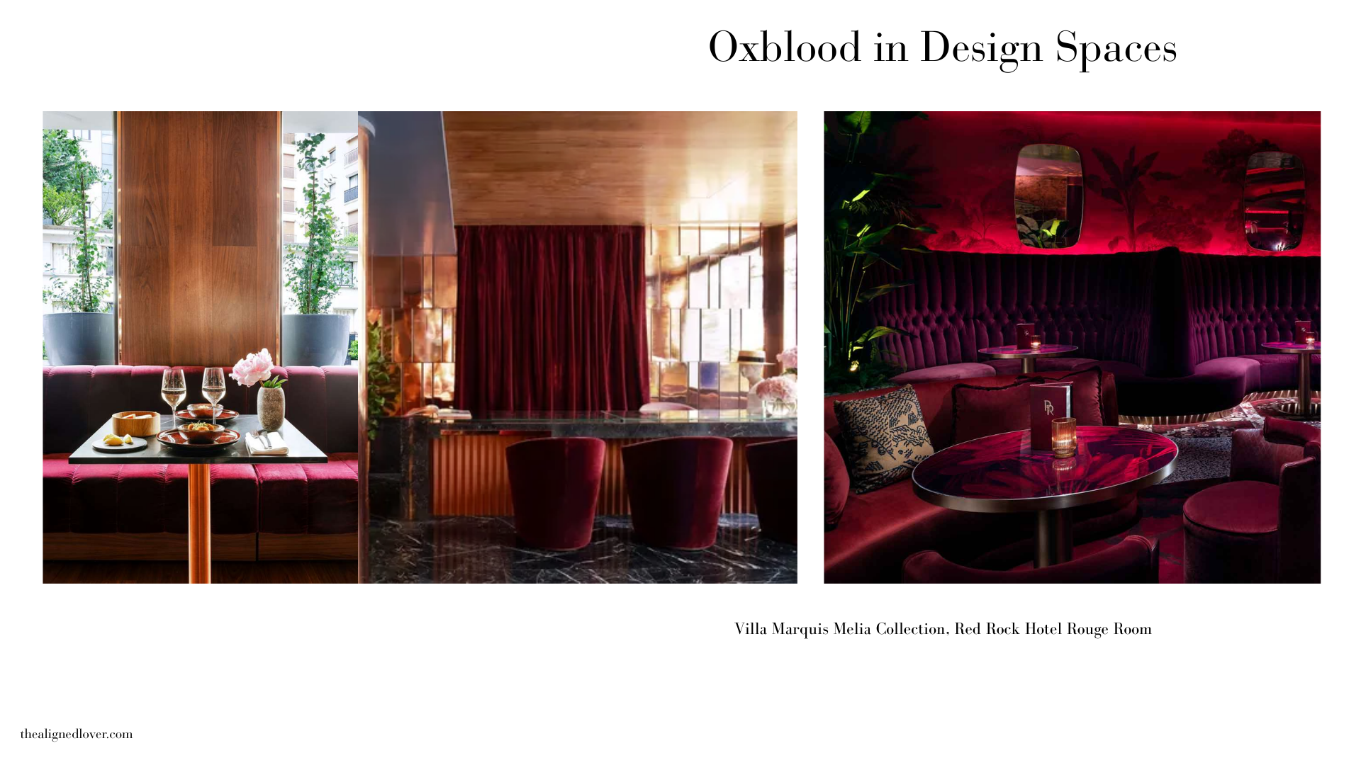 Recently, oxblood has re-emerged in interior design. As millennial minimalism recedes, richer tones have started to return, creating room for colors with more visual substance. Oxblood appears in upholstery, wall finishes, furniture, and architectural details across both residential and commercial interiors, including the Villa Marquis Meliá Collection hotel in Paris, renovated in 2021, which incorporates deep red upholstery and finishes within its public interiors, and the Rouge Room in Las Vegas, redesigned between 2022 and 2023, where deep red textiles and lacquered surfaces are used throughout the space.