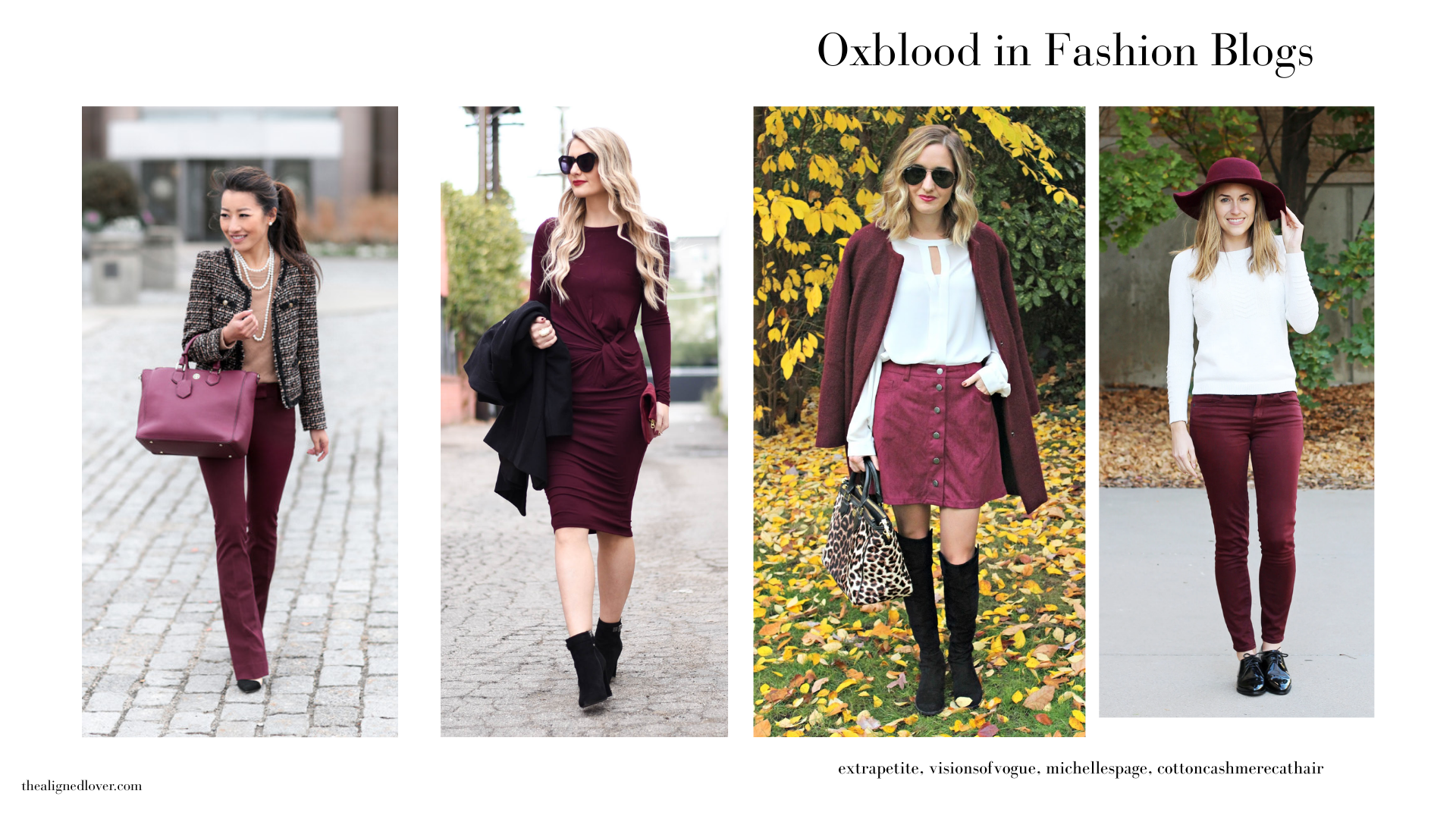 The color, and its close variants such as burgundy and deep berry, also saturated much of the 2015-2016 fashion blog-o-sphere, with oxblood splashed across button down skirts over knee highs, cocoon cardigans, skinny jeans, and the knot dress.