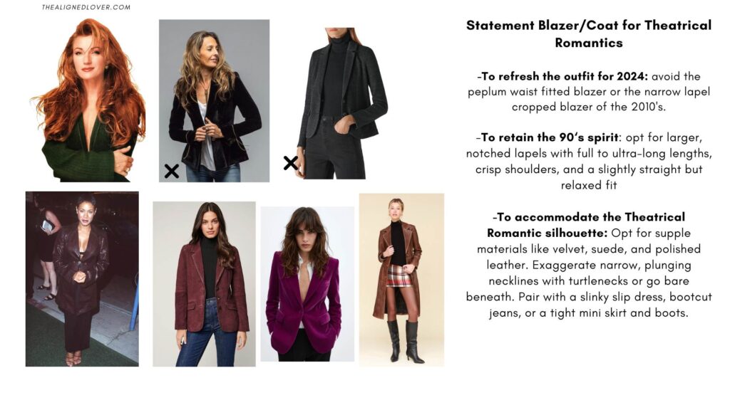- Statement Blazer: A statement blazer or coat for Theatrical Romantics is essential. We are looking to Jane Seymour and Ms. Jada Pinkett Smith for inspiration—plunging necklines, strong statement outfits.