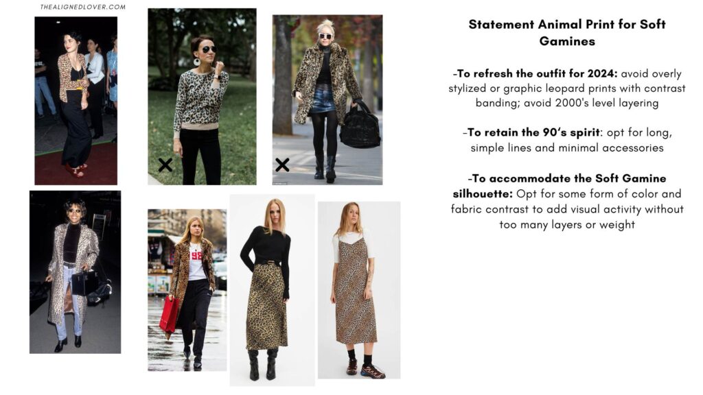 For the Soft Gamine, statement animal print can work, though I usually don’t recommend animal print for Soft Gamines because a pattern or animal print that isn’t overly intricate and ornate or graphic is essential. However, since we are borrowing from the 90s, it has a different spirit to it; the rules are different.