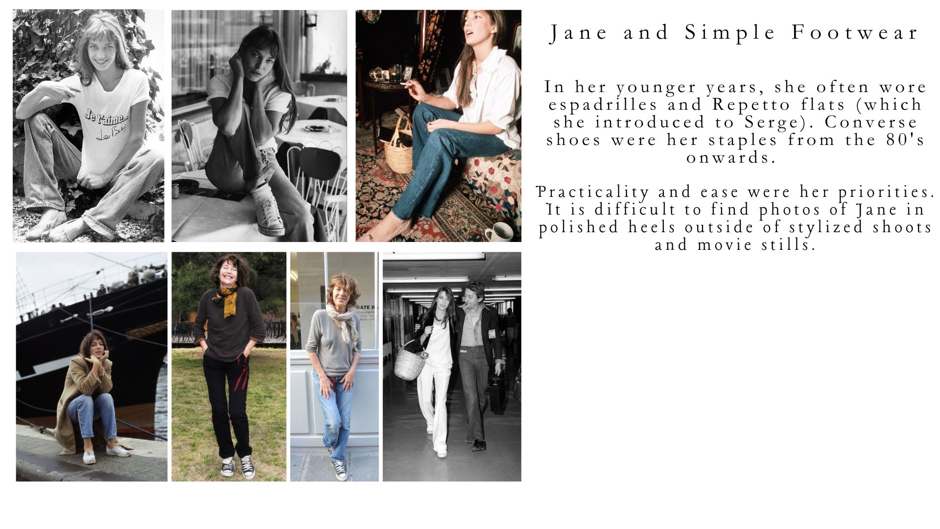 Another aspirational aspect of Jane’s wardrobe was her footwear. She consistently chose practical, comfortable shoes for everyday wear. Whether in sneakers, espadrilles, or leather Repetto ballet flats, comfort was key. Jane was often seen in sneakers like Converse, where she’d casually leave the laces undone and even pull out the tongue to create a more laid-back vibe.