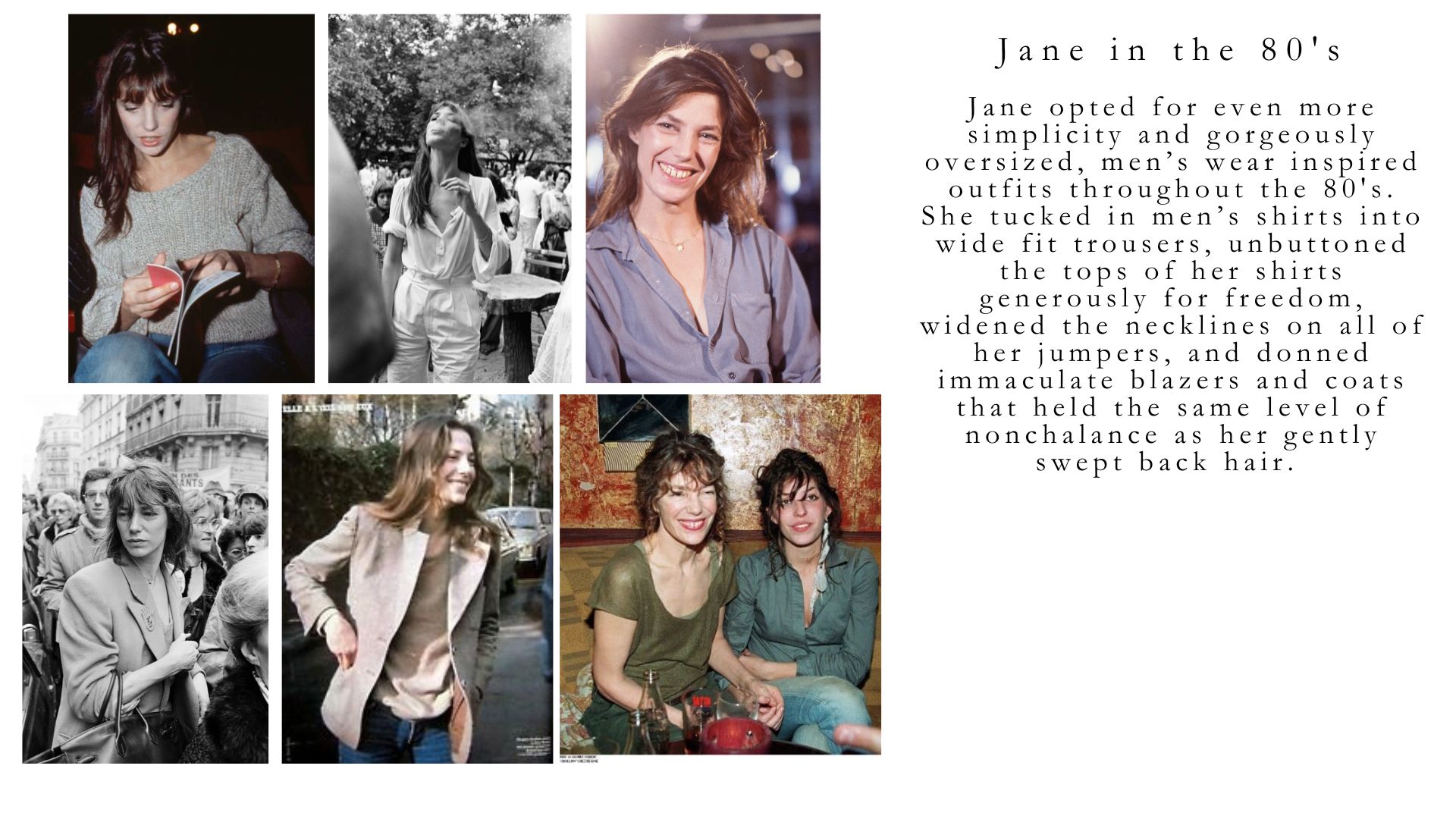 In the 1980s, Jane embraced oversized pieces, often opting for men’s shirts that she unbuttoned at the top. She’d cuff the sleeves and open the necklines, adding volume and movement. She also swapped tight denim for wider, looser trousers, creating a more relaxed silhouette. Whether wearing an oversized blazer or a simple fitted coat, Jane’s wardrobe exuded ruggedness, with nothing too stiff or polished.