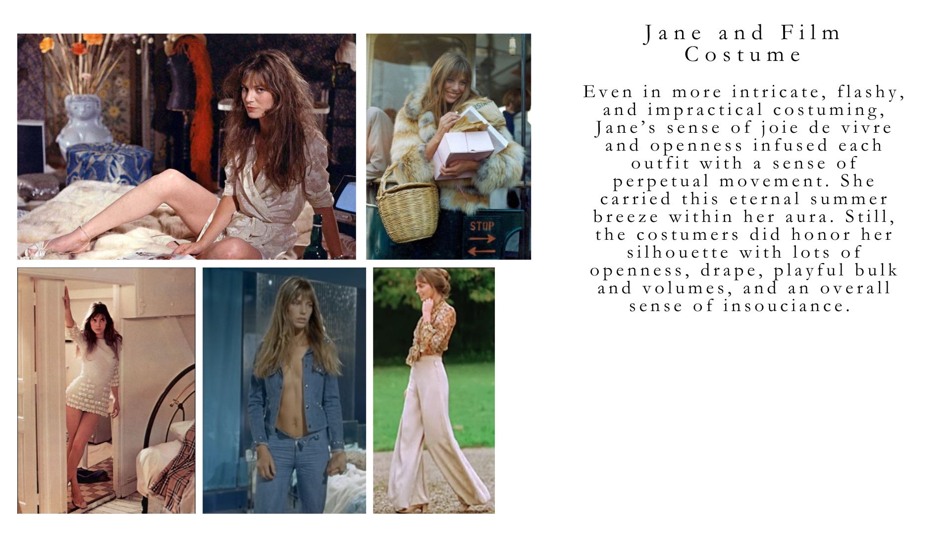 Even in her more glamorous movie costumes, Jane’s signature style shone through. While these costumes were more intricate and flashy than her daily wear, they still carried the same sense of ease and playfulness. My favorite moment of Jane’s film style was when she walked onto a driveway wearing silk pants and a messy Gibson girl bun in Le Mouton Enragé(1974). It perfectly illustrated how style can be dependent on chance: when everything comes together effortlessly.