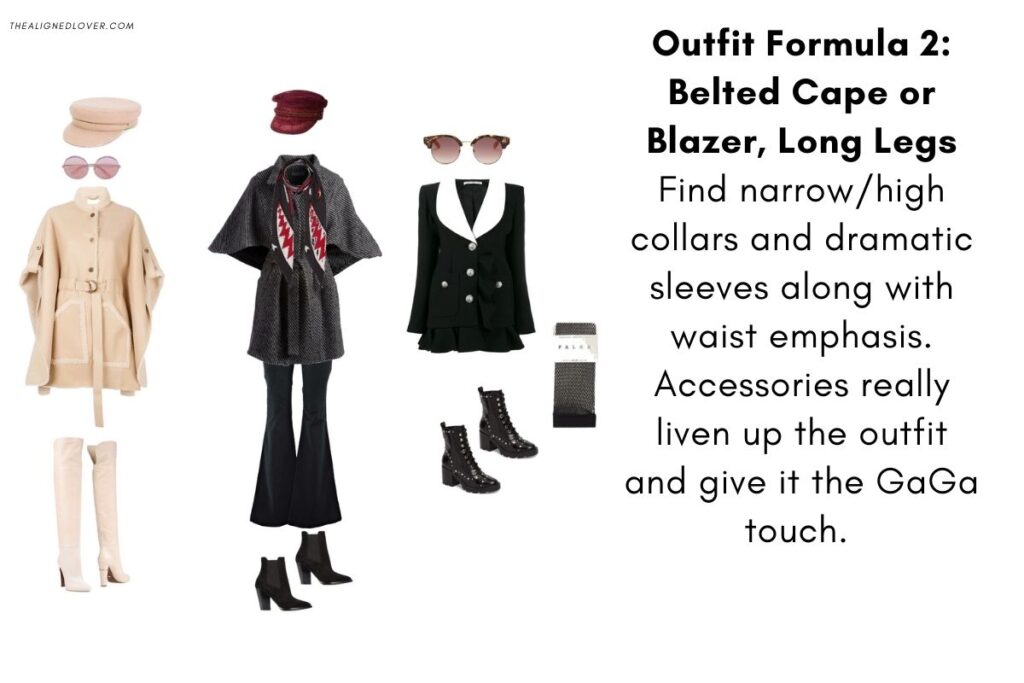 For this formula, opt for a belted cape blazer with shoulder and waist definition, especially one with a higher neckline or a narrow plunging neckline. Angular flaring below the waist adds to the angular outline that suits the flamboyant gamine silhouette. Dramatic, non-voluminous sleeves draw attention to the shoulders. To complete the look, pair the blazer with slim boot-cut trousers, pointed-toe boots, and accessorize with statement jewelry. The contrast between the sleek leg line and the bold shoulders creates an eye-catching effect.