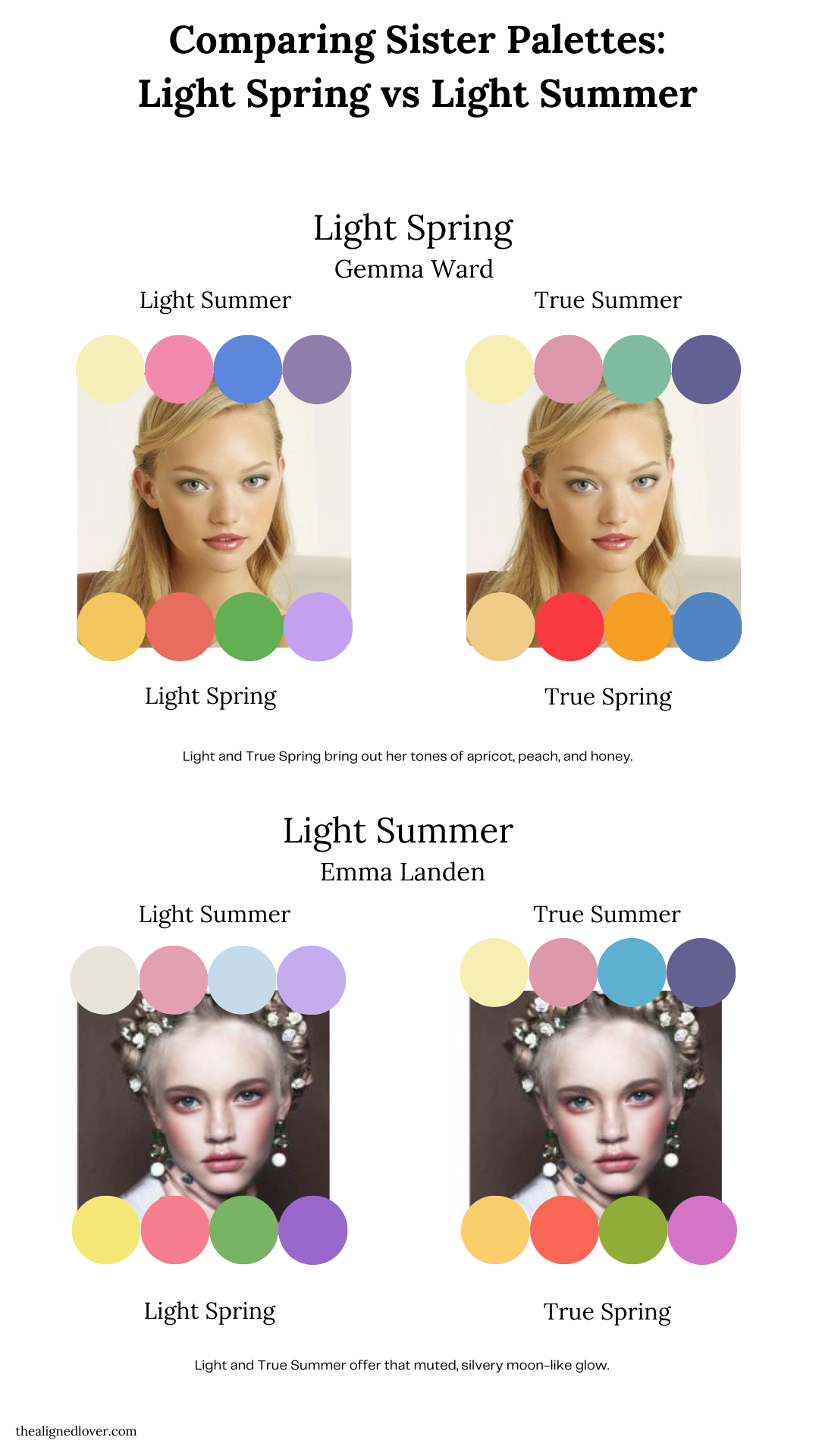 Light Spring Scarlett looks more radiant and defined with the warmer colors that connect to the apricot, peach, and coral shades throughout her face. Summer looks too dull and flat on her. Oppositely, Light Summer Michelle looks ethereal in Summer’s muted and powdery shades, whereas Spring’s warmth weighs her down.