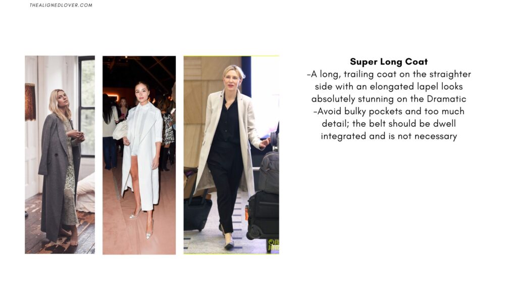A long, streamlined coat with a narrow lapel enhances the dramatic silhouette. Avoid bulky details like oversized pockets, wide belts, or voluminous fabric at the waist. If the coat has a belt, it should be integrated into the design rather than sitting as an added detail.