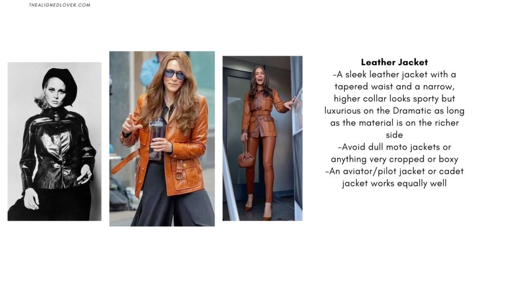 A sleek, slightly tapered leather jacket is ideal. A longer length helps define the shoulder shape, and a slightly shiny leather adds a luxurious yet sporty feel. Avoid cropped or boxy styles. If a moto jacket isn’t your preference, try a tailored aviator, pilot, or military-inspired jacket.