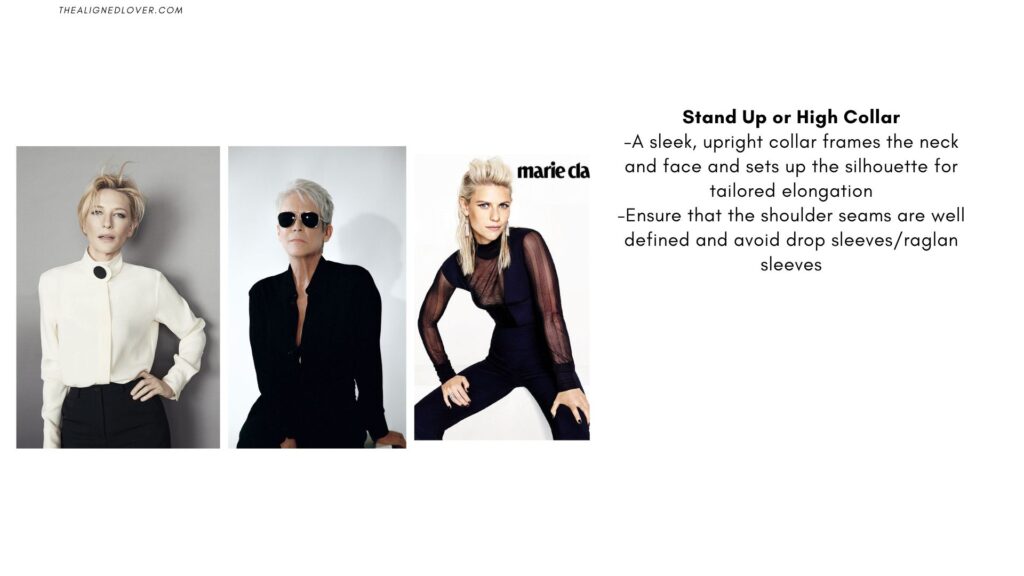 A sleek, structured high collar frames the neck and face, creating a tailored, sculpted elongation. If the blouse has sleeves, ensure the seams are well-defined. Avoid drop sleeves or raglan sleeves, which can round the shoulders and add volume to the upper arms.