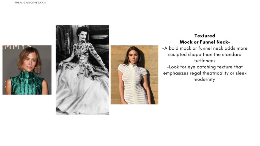 A mock or funnel neck offers a more sculpted, tailored look than a standard turtleneck, which can sometimes appear too drapey or clingy. This style is more architectural and bold. You can opt for sleek, eye-catching details—either a regal, classic look or a more modern aesthetic.