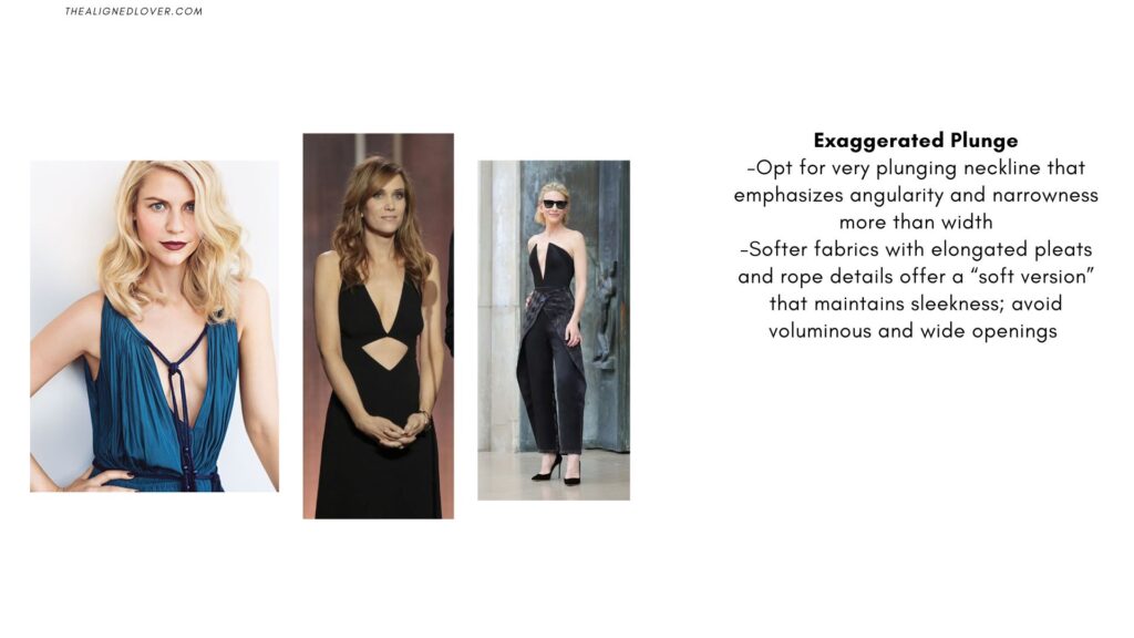 For a softer material, choose a sleek, silky draped style. If pleats are incorporated, keep them linear and thin rather than wide and voluminous. A more form-fitting version should have an angular cut to maintain that strong, structured look.