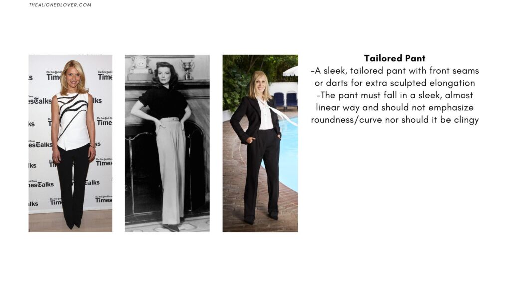 Tailored pants with front seams or darting create extra elongation and definition. The pants should fall sleekly, without bunching at the foot or clinging too tightly. A smooth, structured line is key to maintaining a streamlined silhouette.