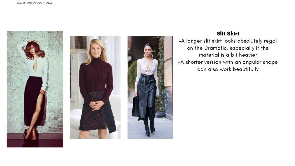 A long slit skirt in a heavier material looks regal and sophisticated. If opting for a shorter skirt, ensure it has sharp, structured lines. Asymmetrical details can add an element of refinement and elegance.