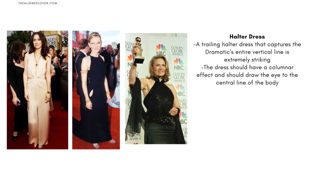 A well-structured halter dress enhances verticality, drawing the eye up and down rather than widening the silhouette. The emphasis should be on length and clean lines rather than distracting details that break the visual flow.