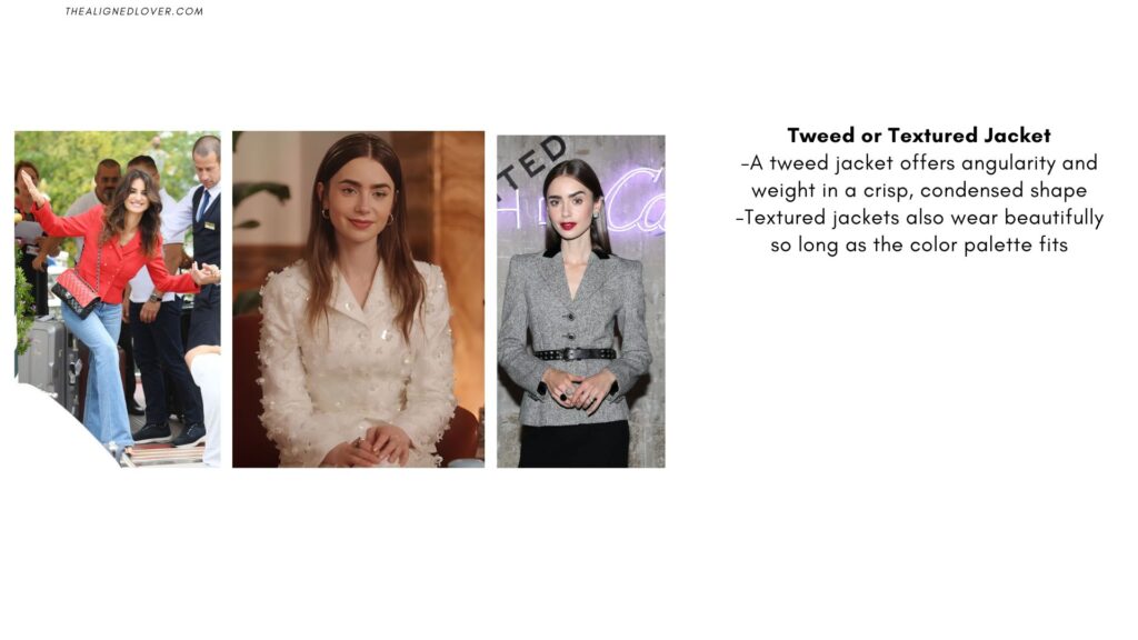 Outerwear is an important element in any wardrobe, and textured jackets like tweed are perfect for the Flamboyant Gamine. Look for options with defined shoulders and angular lapels. Single or double-breasted styles work well, and you can fold the sleeves neatly for a tailored appearance.