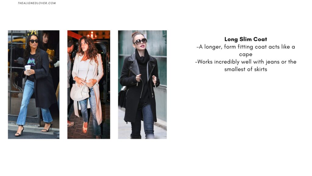 A long, slim coat is a versatile outerwear choice. Look for styles with notched lapels, narrow lapels, or no lapel at all. Prioritize coats that remain form-fitting, even when unbuttoned, for a sleek, cohesive silhouette.