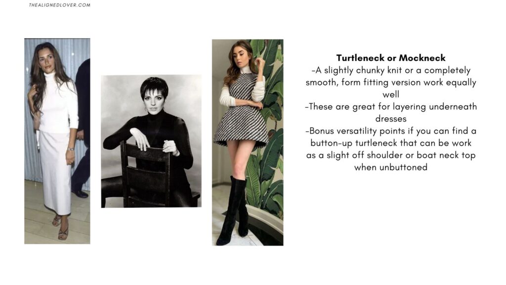 Turtlenecks and mock necks are timeless staples for a Flamboyant Gamine capsule wardrobe. Opt for chunky knits to add texture or smooth, form-fitting styles for effortless layering. These pieces work well under dresses and jackets. For maximum versatility, look for button-up turtlenecks that can also be styled off-shoulder or as a boat neck, offering multiple ways to wear them.