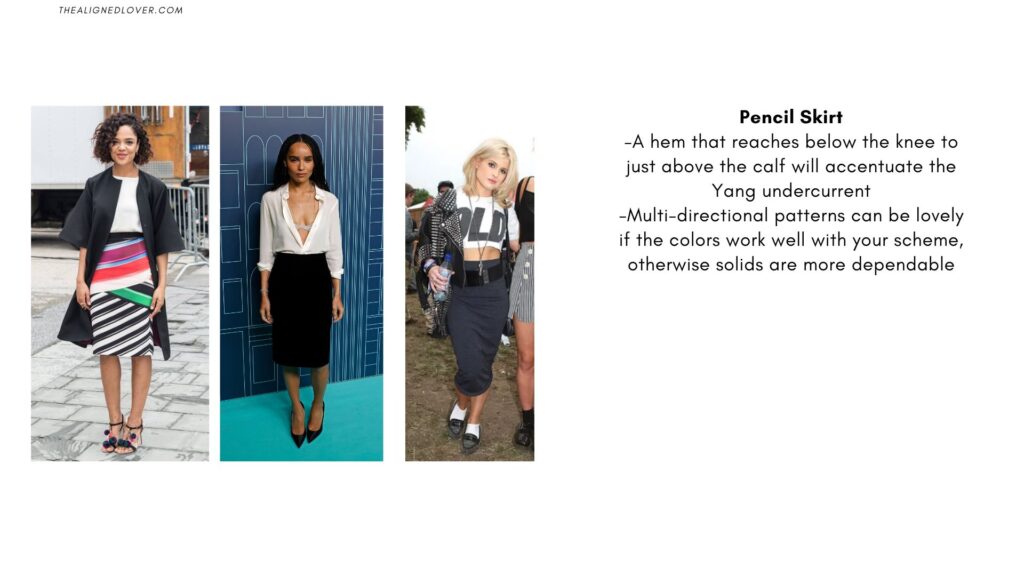 A pencil skirt is a must-have for any Flamboyant Gamine wardrobe. For versatility, choose a length that falls just below the knee or mid-calf. These lengths accentuate the sleek, elongated silhouette typical of the Flamboyant Gamine. Opt for solids or experiment with multi-directional patterns to add subtle interest without overwhelming the look.