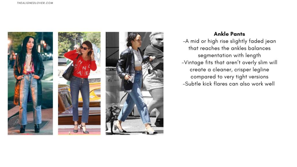 Ankle-length jeans are a practical and flattering choice. Vintage denim styles with a mid or high rise are particularly suited to the Flamboyant Gamine aesthetic. Slim fits or subtle kick flares work well, offering both comfort and style. If you prefer trousers, look for a similar cropped fit that balances your overall proportions.