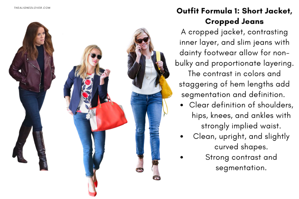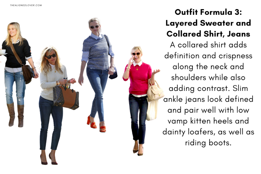 This formula embodies Reese Witherspoon’s perky and energetic persona, featuring a layered sweater and collared shirt paired with jeans. The collared shirt adds contrast to the sweater, emphasizing the neck and shoulders, while the higher neckline of the sweater allows the torso to be communicated clearly.