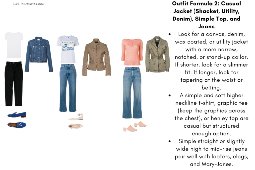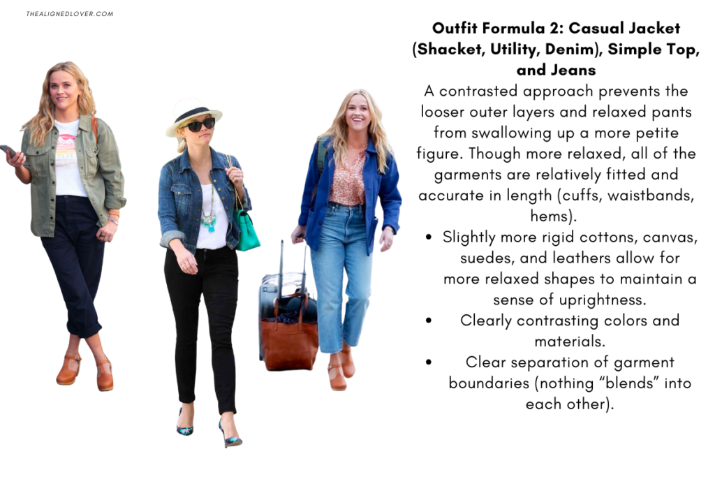 This formula embraces a more relaxed and casual style, featuring a jacket or shirt jacket paired with a simple top and jeans. The contrasted approach prevents the looser outer layers from overpowering the body, maintaining the distinction between contours and tapering.