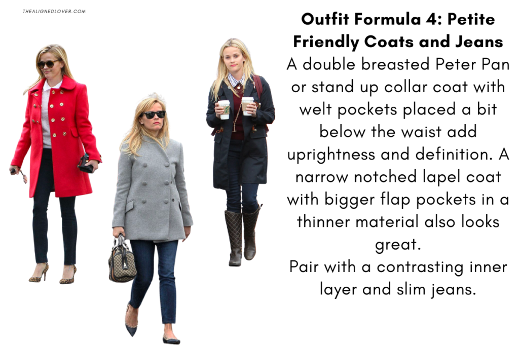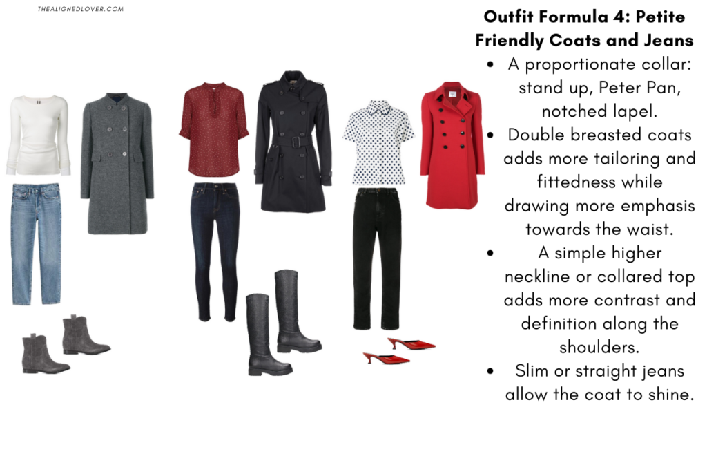 Our first outfit formula features a shorter jacket paired with slim jeans, creating a proportionate and well-defined silhouette for petite frames. The cropped jacket, contrasting inner layers, and slim jeans, combined with dainty footwear, allow for non-bulky and stylish layering that accentuates the body’s natural contours.