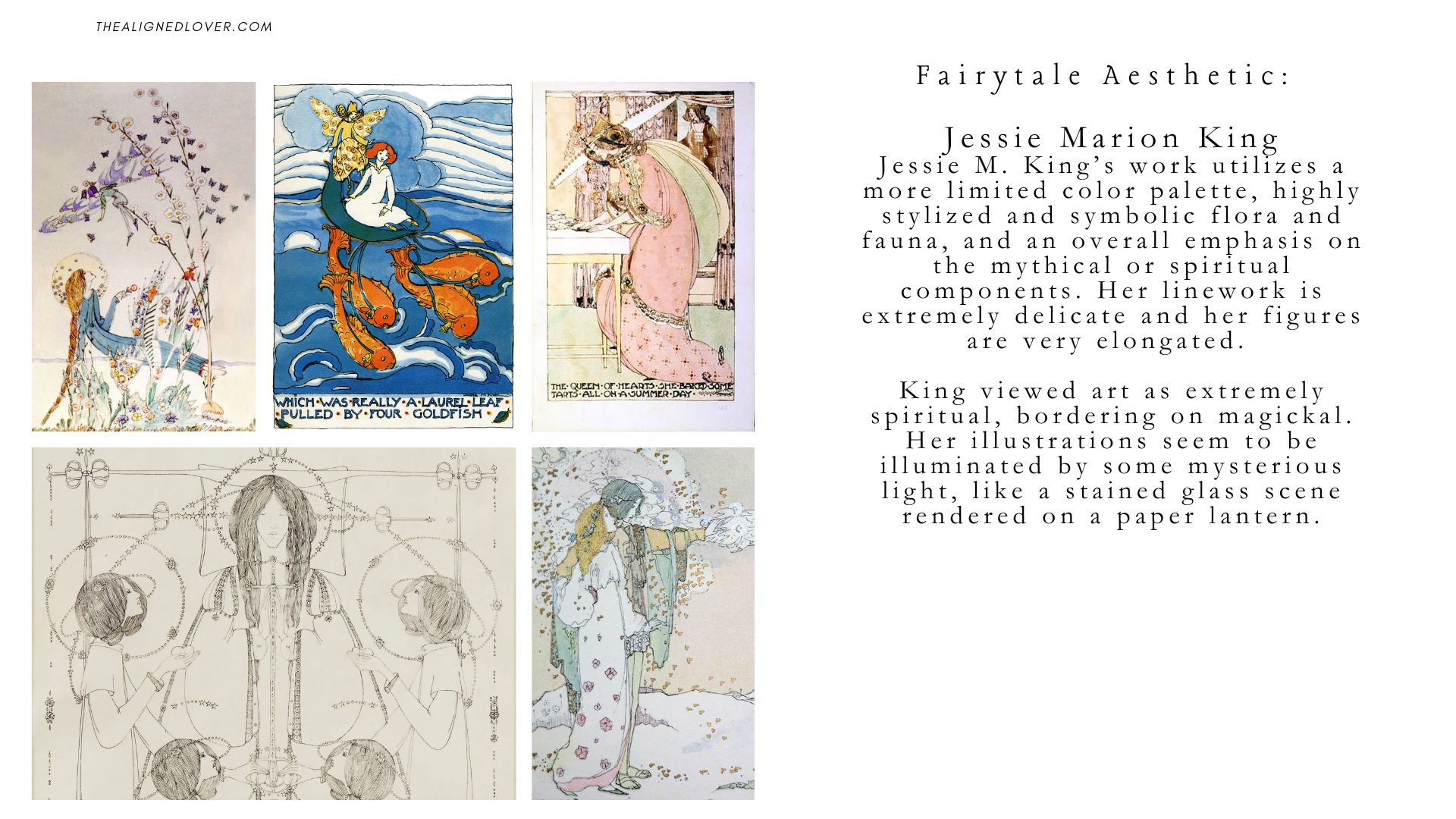 Jessie M. King approached illustration as a spiritual practice. Her color palettes are often limited and carefully chosen, her linework is delicate and fine, and her figures are impossibly slender, almost otherworldly.