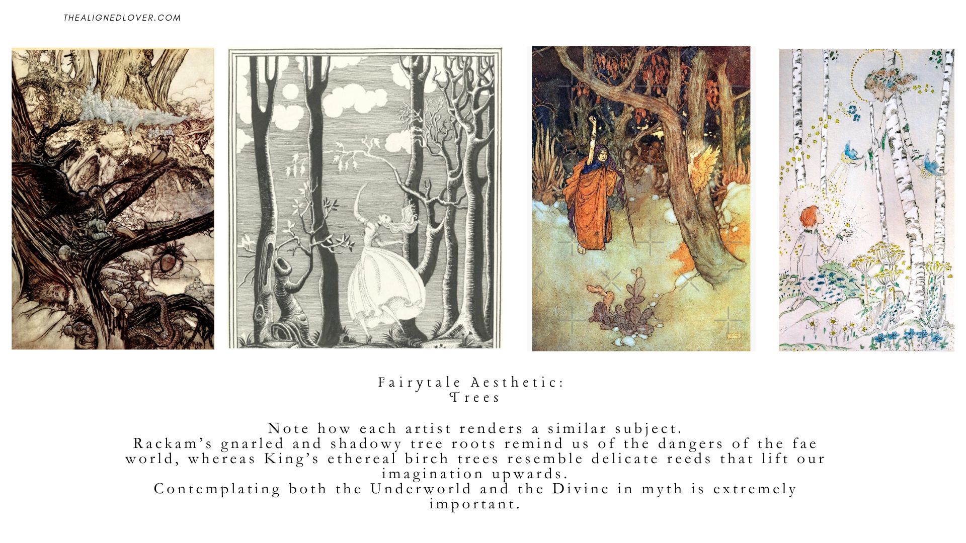 Take note of how each artist renders a similar subject. Rackham’s gnarled and shadowy tree roots remind us of the dangers of the fae world, while King’s ethereal birch trees resemble delicate reeds that lift our imagination upwards. These contrasting interpretations highlight the dual nature of trees in mythology; they symbolize both the Underworld and the Divine. Trees often act as a connection between these realms, making them a powerful symbol in fairytales.