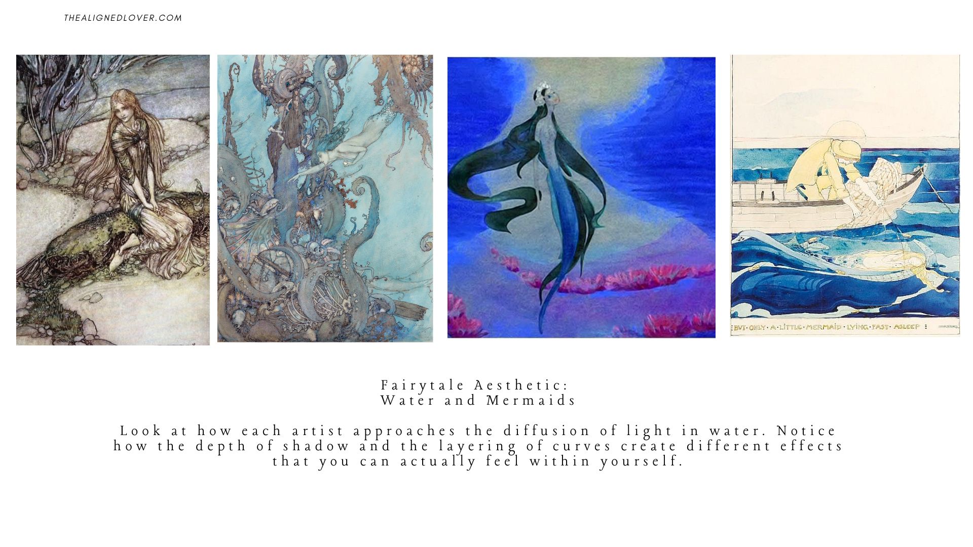Each artist approaches the diffusion of light in water differently. Look at how Rackham uses deep shadows to create mystery and a sense of depth, while Nielsen’s smooth, ethereal water gives an almost otherworldly quality to his mermaids. The depth of shadow, paired with the layering of curves, creates a tangible emotional effect in each image, evoking a different mood. This interplay of light and shadow within water is a powerful visual tool for illustrating both the unknown and the magical qualities of the fairytale world.